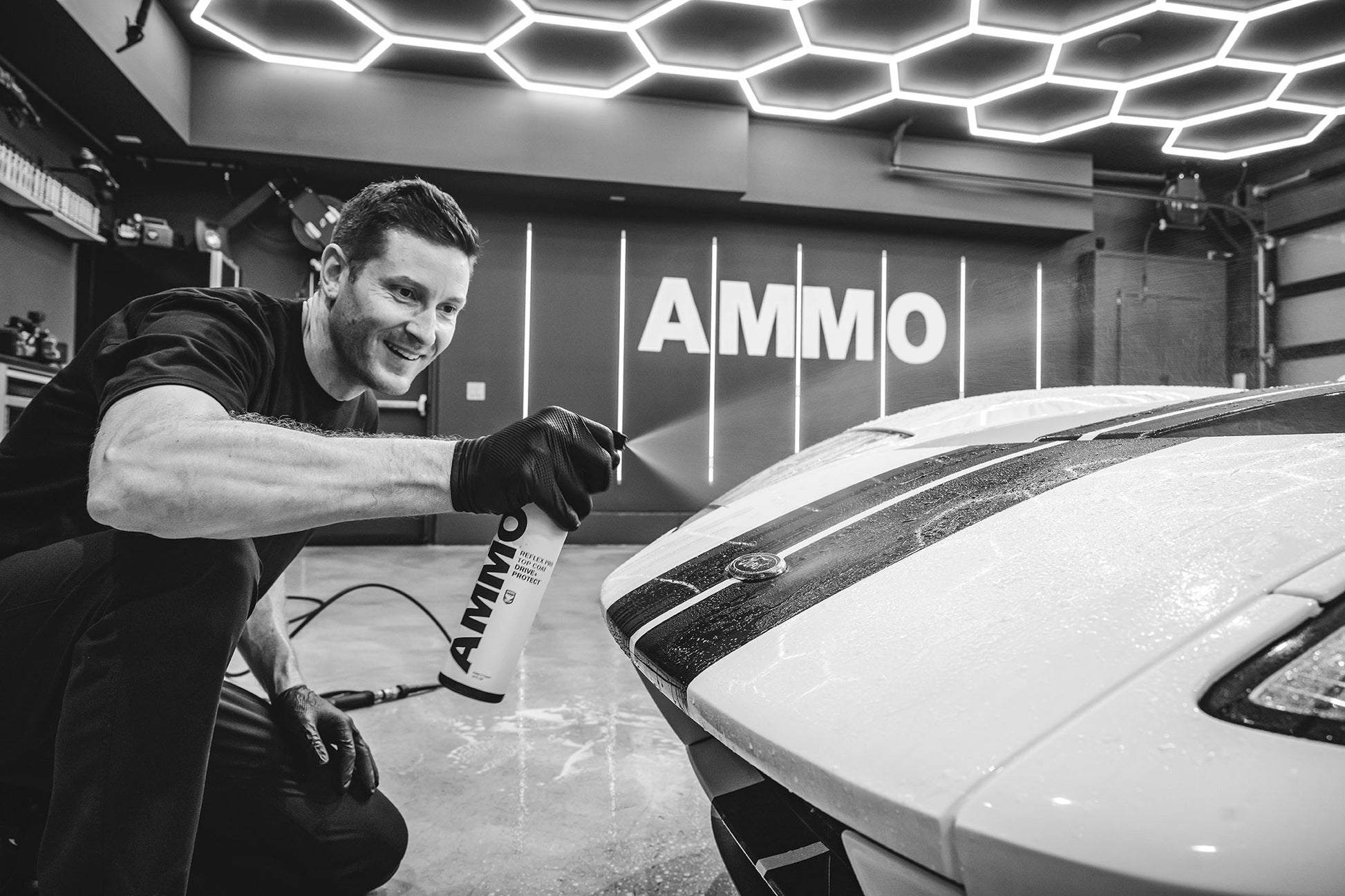 AMMO REFLEX PRO TOP COAT is a sprayable ceramic topper designed to add 2-3 months of clear coat protection while giving your car’s paint that exclamation point (!) of shine. No exaggeration – grab your shades after you apply. It works great on cars already coated with REFLEX to boost protection, but can also be used on untreated surfaces. And if you’re a fan of those water repelling shots, get your cameras ready – TOP COAT causes beautiful little pools to bead off your paint. Watch as it all drips right off. Yum.