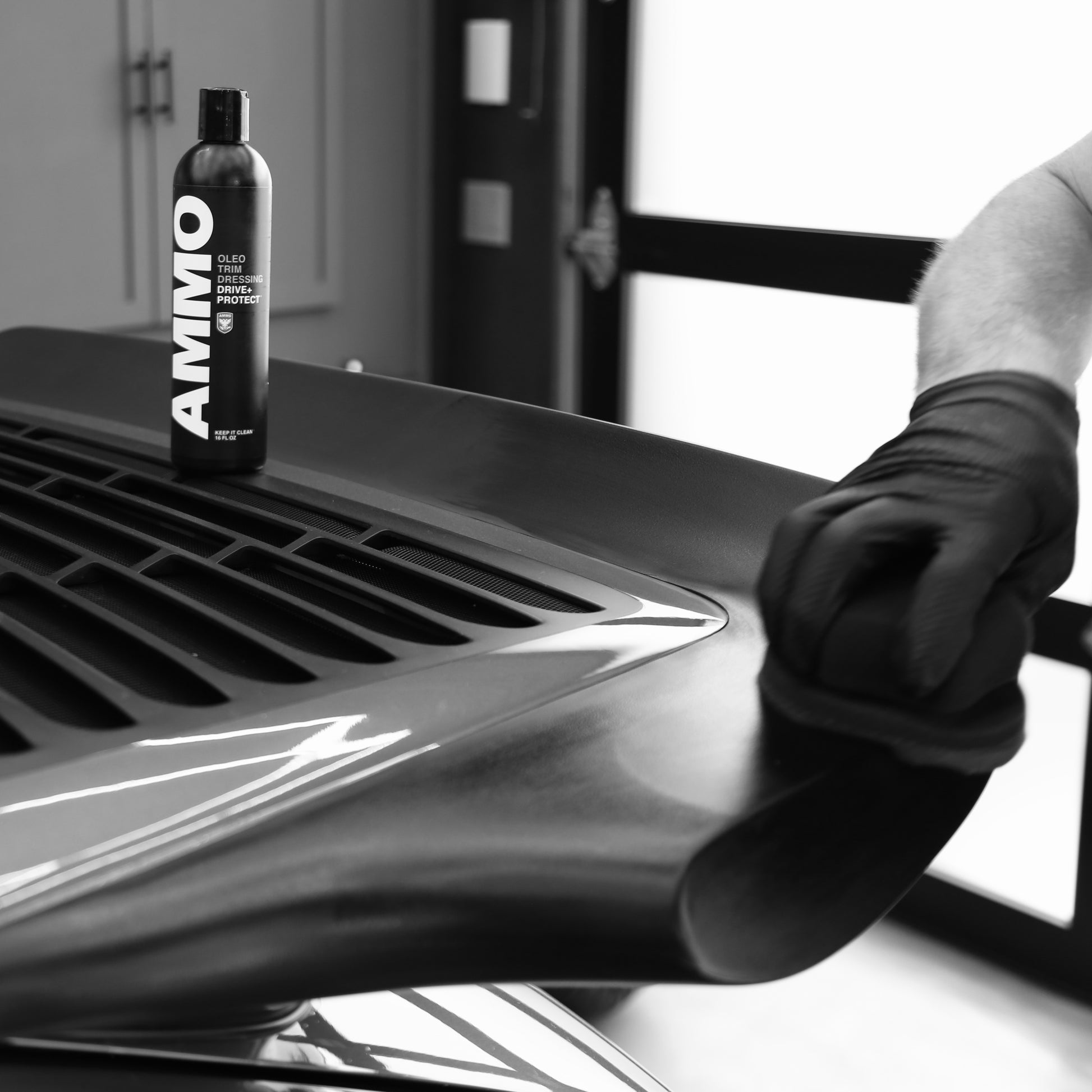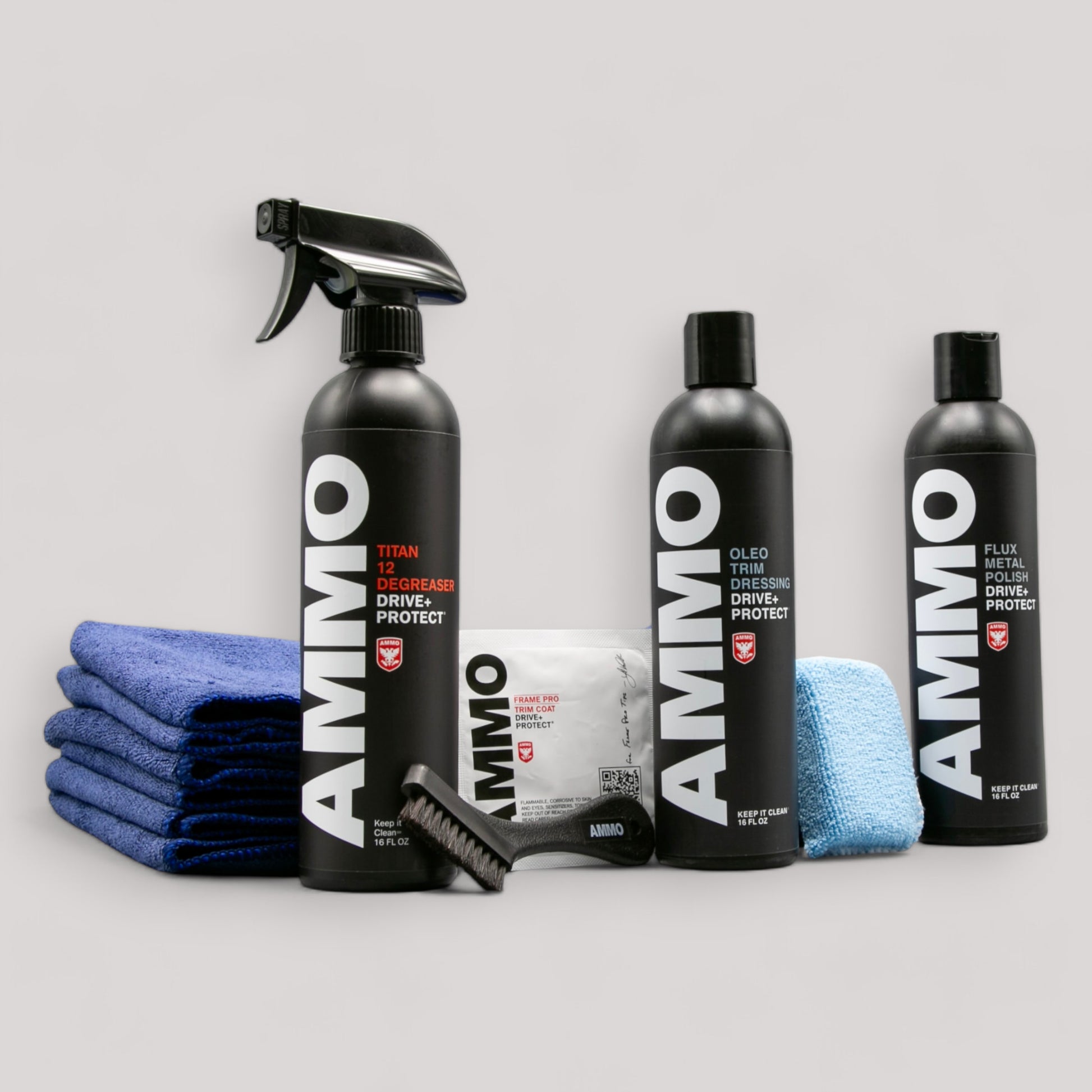 The AMMO Trim Regimen features our cleaning, protection, and maintenance formulas for exterior plastic, rubber, and bright work. Clean black rough plastic and rubber with Titan 12 Degreaser. Restore and coat rough black plastic with Frame Pro. Maintain rubber and plastic trim with Oleo Trim Dressing. Polish and protect chrome and metal surfaces with Flux Metal Polish. Includes our Seam & Stitch brush and a six-pack of Blue MF towels. All the products and tools required for the intricate details of your vehicle.