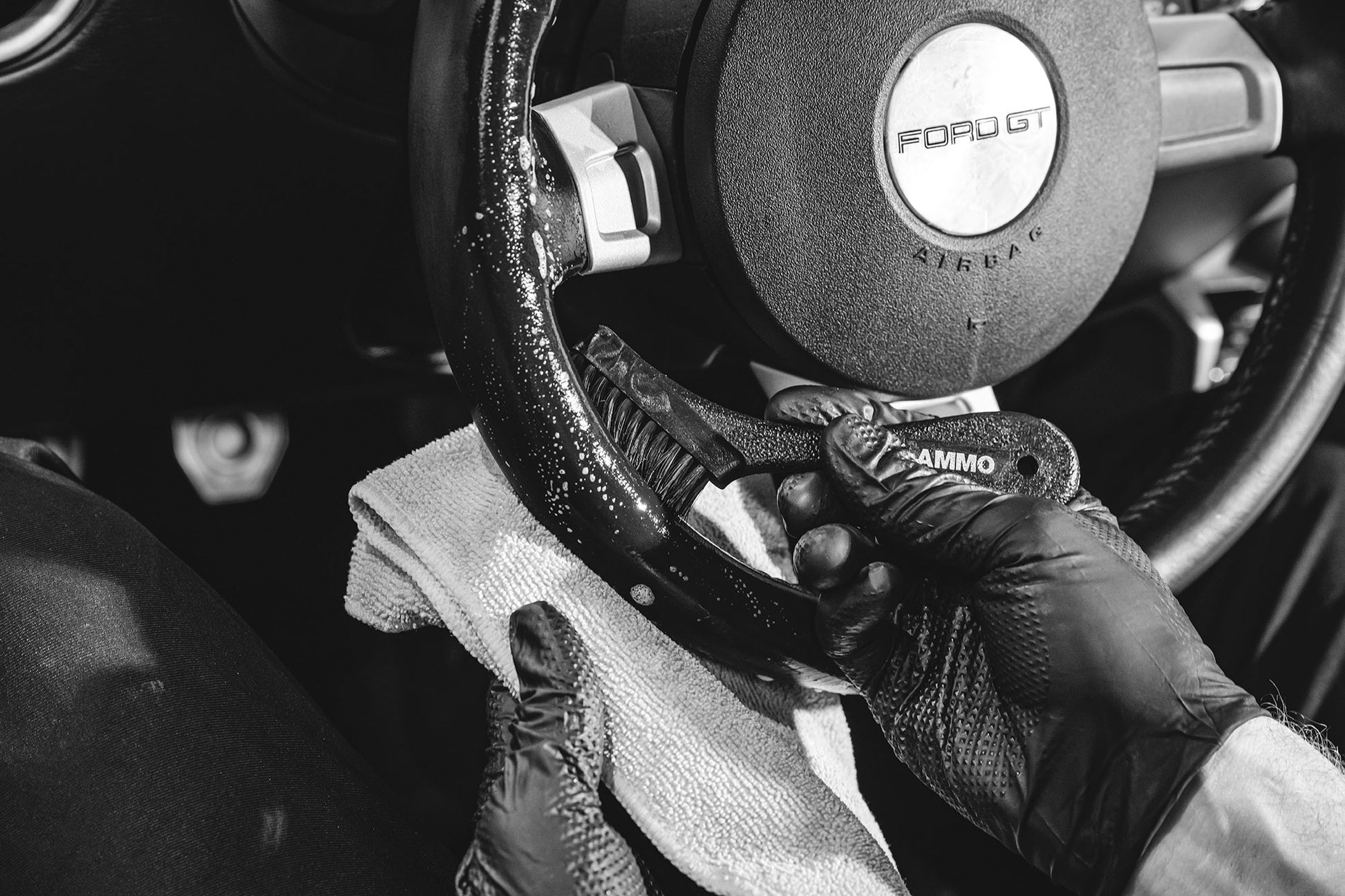 Contrast stitching – beautiful to behold, but maybe not so easy to clean. The AMMO SEAM + STITCH BRUSH will help you clean those hard to reach spots with its slim design. Medium stiff horse hair works great on steering wheels, tight trim pieces, leather and plastic.
